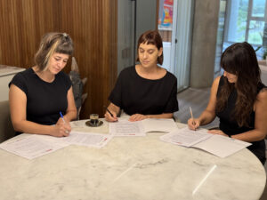 La firma del convenio contó con la presencia de la Decana de la FAD, DI Ianina Ipohorski, el Secretario General, Arq. David Rincón, la Secretaria de Extensión, Lic. Inés Rozze, la Abogada Antonella Asencio, y las docentes Lic. Julieta Daga y Lic. Laura Bringas, responsables del dictado y la coordinación pedagógica del proyecto.