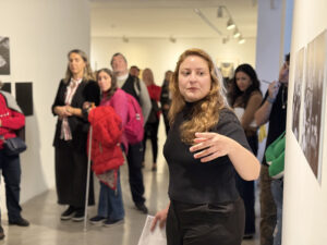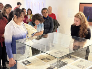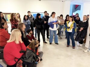 Posteriormente, se realizó una visita guiada por las salas 8 y 9, donde se exhiben obras representativas de las artistas participantes junto con material documental, recortes de prensa, catálogos y dispositivos gráficos que permiten contextualizar sus contribuciones. Esta instancia propició un espacio de diálogo e intercambio que enriqueció la reflexión sobre el lugar que ocuparon estas mujeres en la historia del arte latinoamericano.