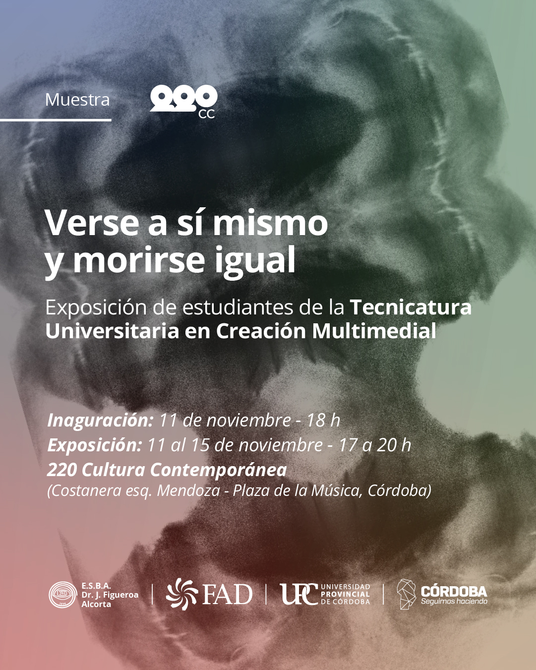 “Verse a sí mismo y morirse igual” se presenta en el marco de un convenio entre la Facultad de Arte y Diseño de la Universidad Provincial de Córdoba y 220 Cultura Contemporánea, con el objetivo de exhibir y difundir la producción de alumnes de la Tecnicatura Universitaria en Creación Multimedial.